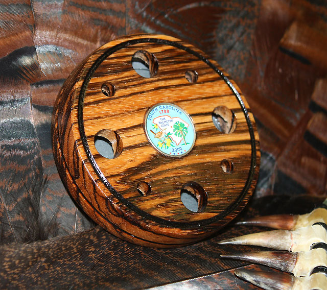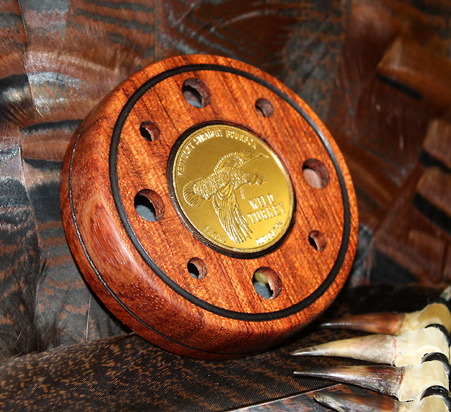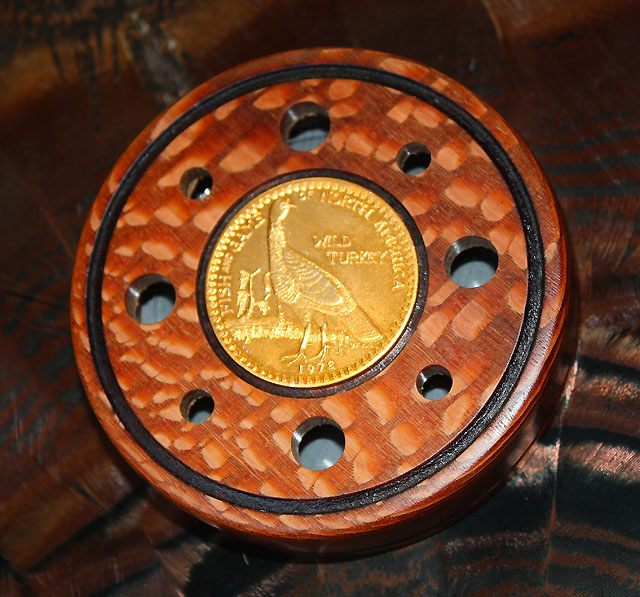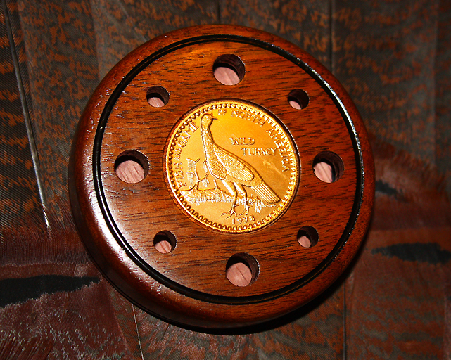 I offer a wide selection of pot calls made from domestic and exotic woods. I can pretty much make a call out of any wood of your choice as well as playing surface and soundboard combination. If you have a particular piece of wood you would like a call made out of, I can do that as well. I like decorating my calls with some sort of inlay, but calls can be made without them if preferred by the customer. I have also been asked to make calls for customers out of woods that are sentimental and very specific (barn planks, boards off of family homesteads, etc.). I can make calls out of these, as long as the specifications and condition of the wood meets my criteria. Please, contact us for pricing.